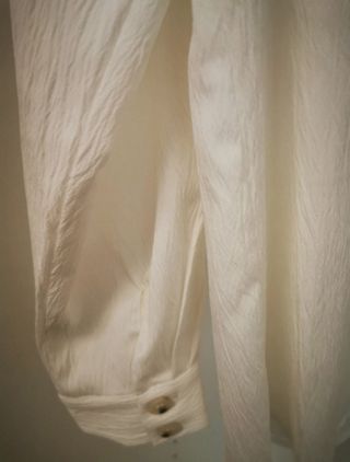 Preciosa camisa de manga larga en color blanco. Es ligera y tiene una textura ligeramente arrugada que le da un toque elegante. - Talla: L - Botones color beige - Corte recto - Tejido suave - 2 botones en cada manga - Sin uso