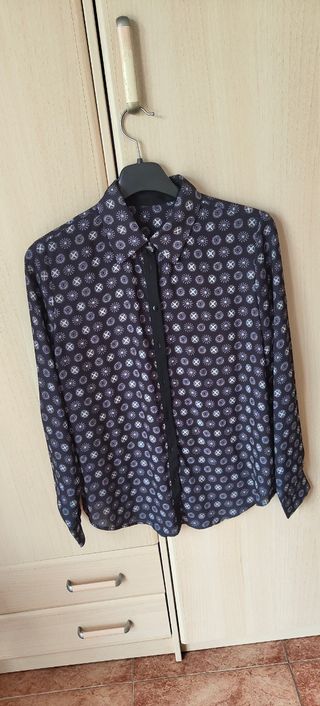 camisa manga larga en color negro con deralles pequeños blancos de Zara talla L como nueva, casi sin uso