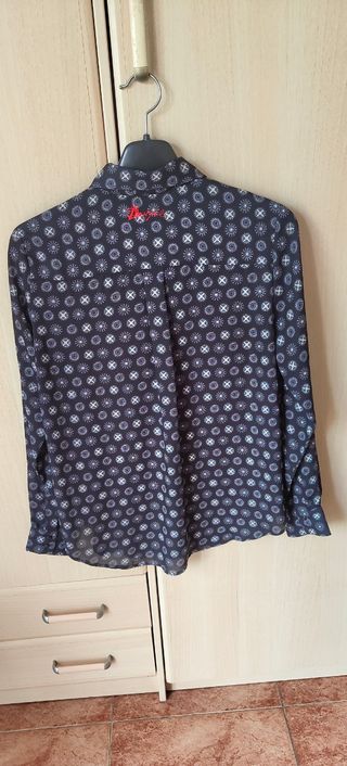 Camisa de manga corta con grabado en toda la camisay un poco calado del mismo dibujo, talla 44 es precioso, está NUEVA prácticamente no se ha usado me la compre pequeña, medidas axila a axila 50cm, largo 65cm