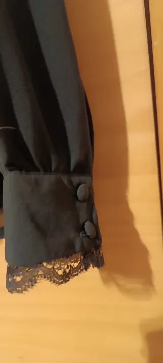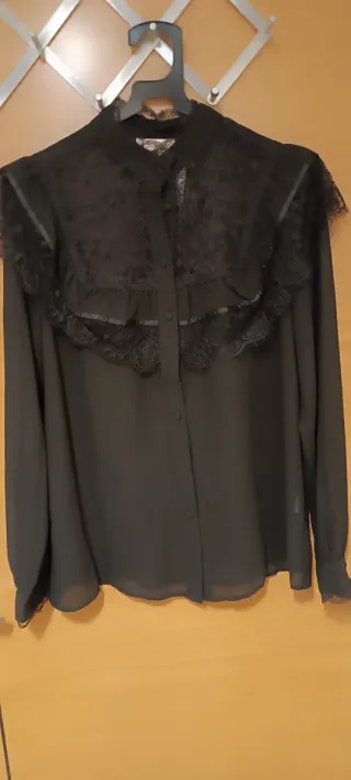 Elegante camisa negra con detalles de encaje y tejido transparente. - Cuello alto con encaje. - Volante de encaje en el pecho. - Mangas largas con puños de encaje. - Cierre de botones. Preciosa para combinar con cualquier prenda o para hacer como de blazer vestido tirantes Más ropa en mi perfil etc