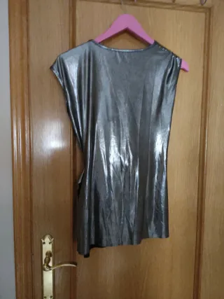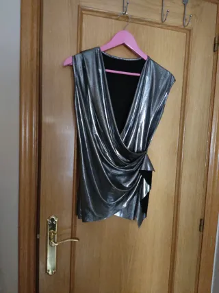 Camisa sin mangas con un llamativo acabado plateado brillante. - Diseño cruzado con drapeado. - Tejido metalizado.