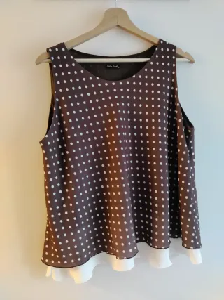Camisa sin mangas color marrón con estampado de lunares en blanco con vuelo. Talla 42. Con caída que estiliza y queda holgada, muy fresca para el verano. Está como nueva.