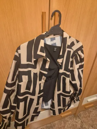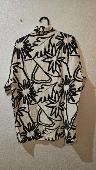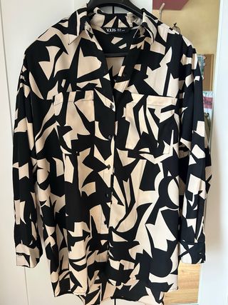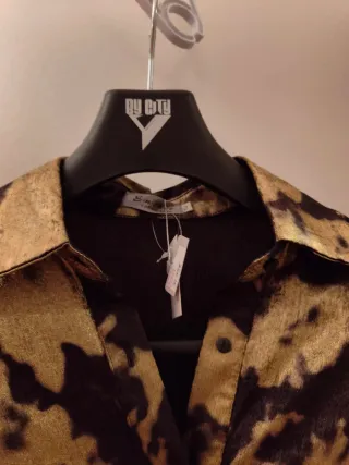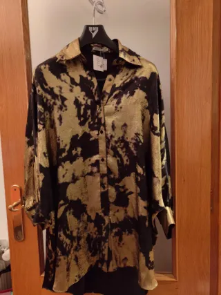 Camisa larga con un diseño llamativo en negro y dorado, perfecta para eventos especiales. - Diseño estampado abstracto. - Cuello camisero. - Cierre de botones. - Manga murciélago con puño. Precio original 34.95€