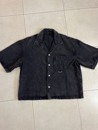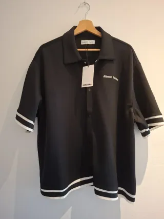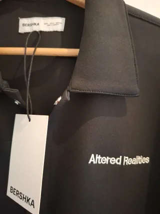 Camisa negra Bershka, estilo oversize, nueva con etiqueta. Diseño tipo camisa-chaqueta con botones, manga corta y ribetes blancos en mangas y bajo. Bordado frontal “Altered Realities”. Tejido fluido y cómodo, ideal para looks urbanos o casual. Talla L (queda amplia). Medidas: hombros 50 cm, axilas 60 cm, largo 73 cm, manga 29 cm. Sin uso, en perfecto estado.