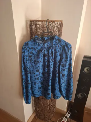 Camisa de manga larga con un bonito estampado floral. - Cuello alto con volantes. - Diseño con flores negras sobre fondo azul. - Mangas abullonadas.