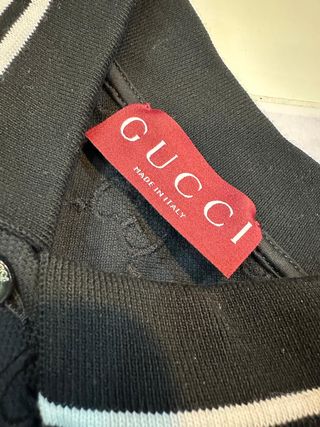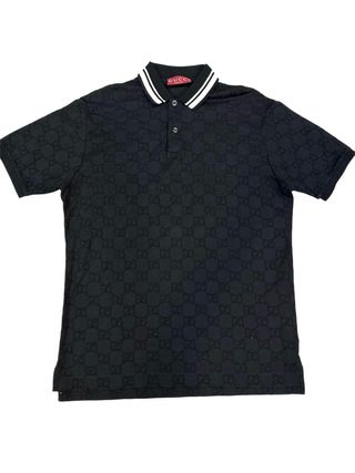 Polo Gucci original, talla M, en excelente estado. Color negro, con logo GG por toda la prenda en relieve tonal. Cuello con rayas blancas y cierre de botones. Prenda auténtica, con etiqueta, sin señales de uso. Perfecta para un look elegante y deportivo. Entrega en mano o envío disponible. Ref: BCN 376