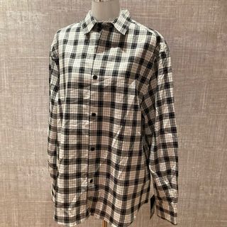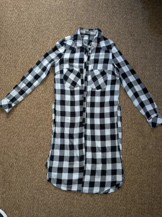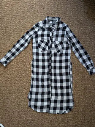 Camisa larga con estampado de cuadros blancos y negros. Presenta un diseño de corte recto y abotonado. - Cuello camisero. - Dos bolsillos en el pecho. - Mangas largas.