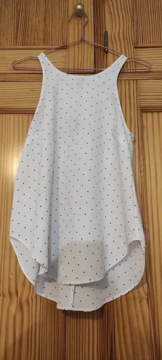 Camisa sin mangas con un diseño de lunares. - Cierre con cremallera en la espalda. - Diseño de lunares negros sobre fondo blanco.