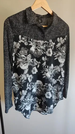 Camisa estampado floral en blanco y negro de manga larga. Muy versátil. - Estampado floral en blanco y negro. - Paneles con estampado de puntos en contraste. - Cuello camisero.