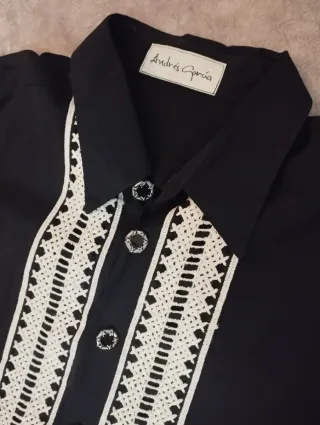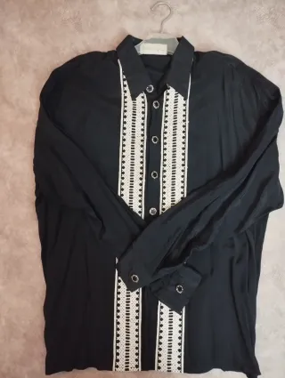 Elegante camisa negra de manga larga, ideal para ocasiones especiales. Se encuentra en muy buen estado. - Diseño con detalles blancos bordados en la parte frontal. - Cuello camisero. - Cierre de botones. - Puños con detalle de botón.