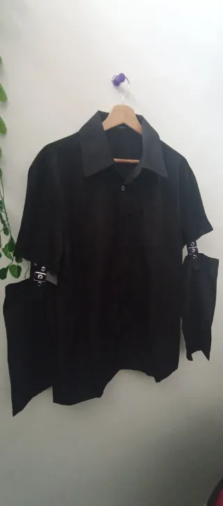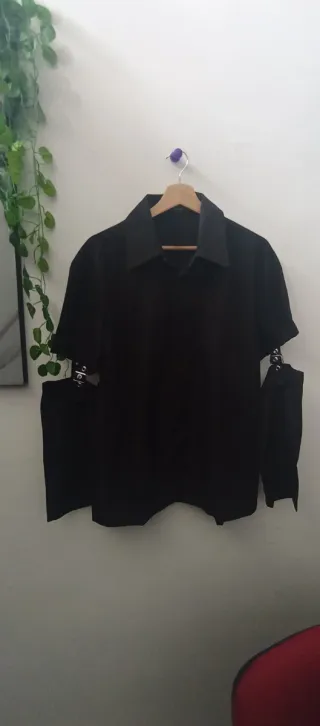 Camisa con un diseño moderno y detalles únicos. - Mangas cortadas con tiras y hebillas. - Cuello tipo polo. Talla S pero parece M