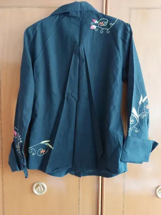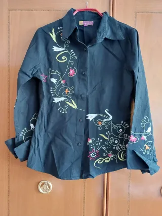 Camisa vintage de color negro con un diseño floral bordado. - Detalle de flores y hojas bordadas en la parte delantera y mangas. - Cuello camisero y cierre de botones. - Mangas largas con puños.