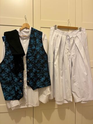 Conjunto tradicional huertano que incluye camisa, chaleco y zaragüel. Se regala fajín. - Chaleco con estampado floral azul y negro.T 52 - Camisa blanca de manga larga. T 48 - Zaragüel blanco con pliegues. T48