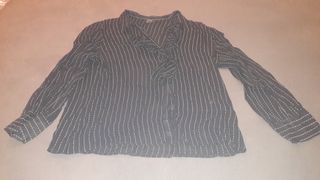 Camisa negra semitransparente con finas rayas verticales blancas. - Diseño con cuello y volantes. - Mangas largas. - Cierre de botones.