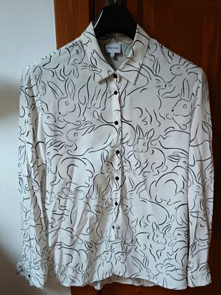 Camisa de manga larga con un divertido estampado de conejos en líneas negras sobre fondo blanco. El cuello es de solapa y tiene cierre de botones. Está impecable.