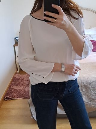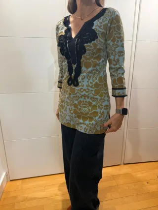 Puedes ver libros y otros artículos en mi otro perfil poniendo en el buscador yolandalibros Zara, perfectas condiciones, usada un par de veces, sin roces ni desperfectos, camiseta o top tejido combinado, el cuerpo es de tela tipo camisa en negro, los laterales tejido camiseta en azul marino y las mangas tela estampada tonos azules y teja, 75% modal y 25% algodón, talla S, podría servir para M, medidas ancho de sisa a sisa 64 cm, ancho parte del bajo 53 cm y largo desde el hombro 60 cm. Por wallapop no me llegan todos los mensajes. Whatsap 646780666 nuevoyym ** caja36r**