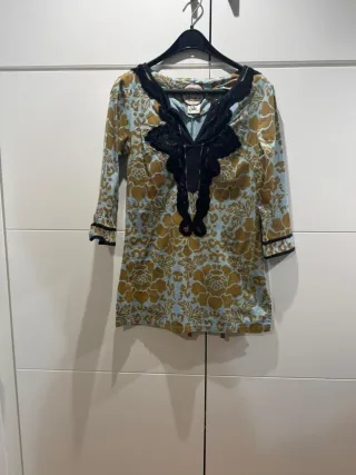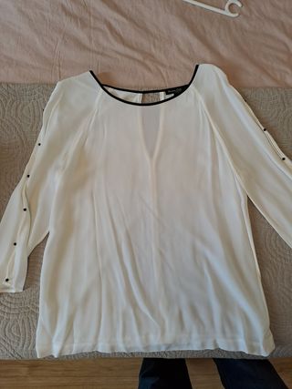 Camisa tipo seda máximo dutti talla M con mangas semiabiertas por botones y cuello ribete negro. Muy bonita