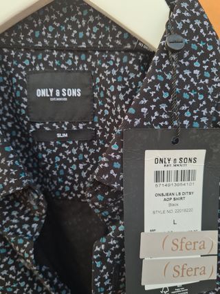 Camisa de hombre ONLY & SONS, talla L, de color negro con estampado azul. Es una prenda elegante y cómoda, perfecta para cualquier ocasión. - Corte slim. - Manga larga. - Cierre de botones.