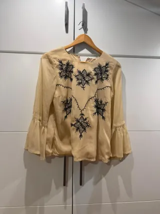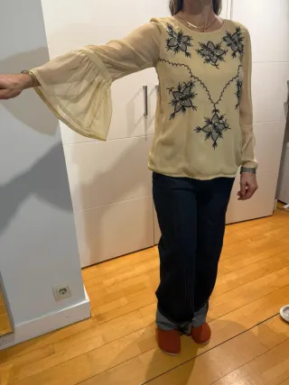 Elegante blusa de manga larga con un delicado bordado floral. - Diseño con mangas acampanadas. - Tejido ligero y vaporoso.
