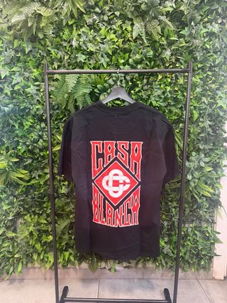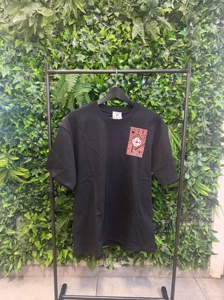 Camiseta negra con un diseño gráfico en el pecho. - Cuello redondo. - Manga corta. - Estampado frontal. - Estampado trasero