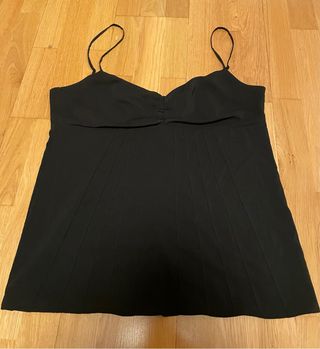 camiseta negra tirante fino regulable detalle de 'pliegues' con cierres en el escote elegante y fresca