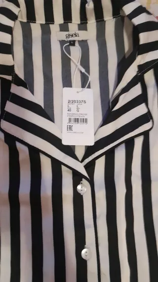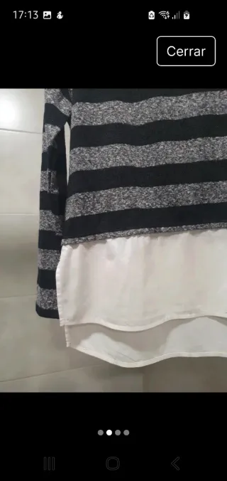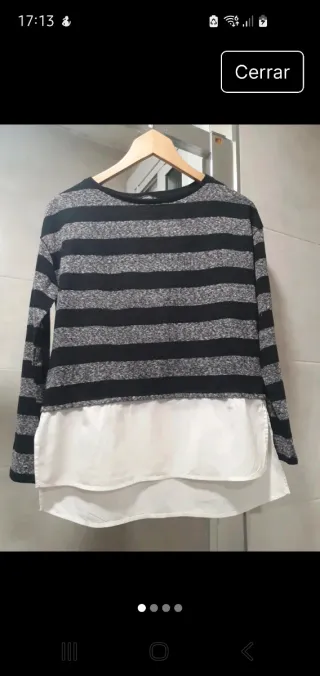 Jersey de Mango con un diseño de rayas. Pone talla S, pero para mi equivale a M. - Diseño de rayas horizontales. - Parte inferior blanca tipo camisa.