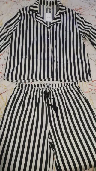 Conjunto de pijama con un diseño clásico de rayas verticales. - Camisa de manga larga con botones. - Pantalón con cintura elástica y cordón ajustable.