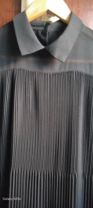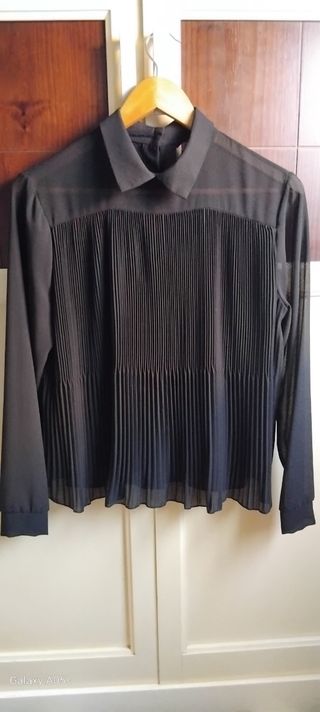 Camisa negra semitransparente con cuello de camisa y plisada por la parte de delante y abotonada por atrás. Sólo tiene un uso.Talla única