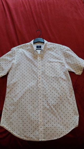 Preciosa camisa para hombre, de manga corta, con estampado de pequeños puntos negros sobre fondo blanco. Está en muy buen estado. - Es de algodón. - Tiene un corte clásico. - Ideal para primavera/verano.