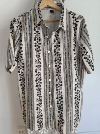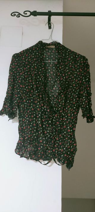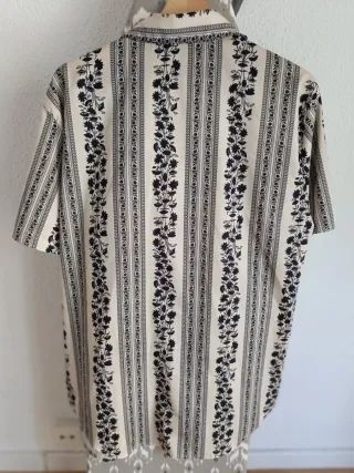 Es una camisa de stradivarius, en color negro con flores verdes, en la talla S, como nueva.
