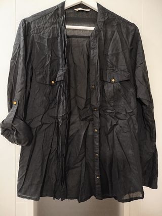 Camisa negra de Zara con botones dorados y bolsillos. - Diseño de manga larga. - Cuello camisero clásico. - Dos bolsillos en la parte delantera. - Cierre de botones dorados.