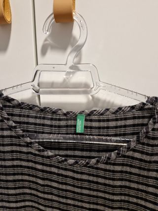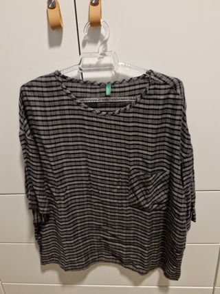 Preciosa camisa de la marca Benetton, a rayas grises y negras. Es de manga tres cuartos y tiene un bolsillo. Perfecta para cualquier ocasión. - Talla M - Corte cómodo - Tejido suave