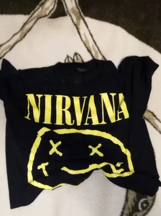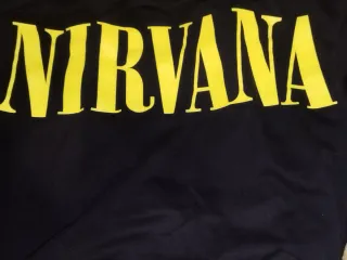 Camiseta negra con el logo de Nirvana y su icónico smiley. - Diseño frontal con el nombre de la banda en amarillo. - Dibujo de cara sonriente con ojos 'X' y boca en amarillo.