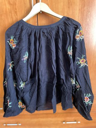 Camisa en color negro con cuello de pico, con flores bordadas en varios colores y botones blancos pequeños alrededor del cuello, talla L de Sfera sin estrenar.