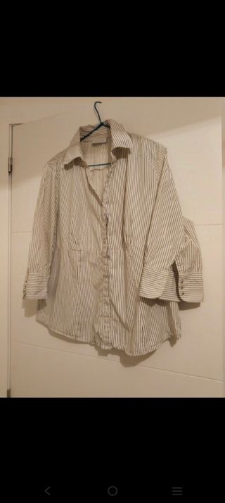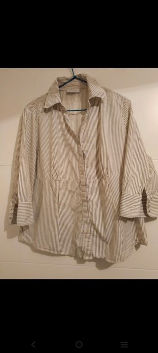 Camisa a rayas negras con corte en la zona del pecho, se ajusta con 3 botones delanteros y los otros están ocultos . Manga pirata o 3/4. Talla 42-44 queda entallada