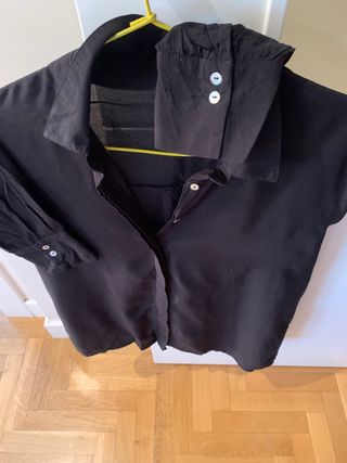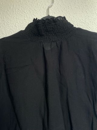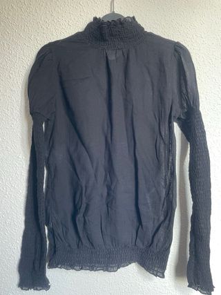 Camisa en color negro, es transparente. En el cuello va fruncida. Las mangas tb y el bajo. En la parte trasera del cuello tiene unos botones. Marca: Bershka. Talla:S