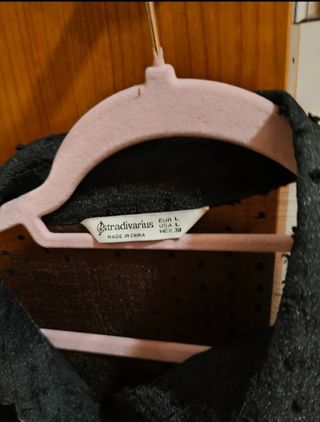 Elegante camisa negra de ZARA con detalles bordados y calados. - Manga larga. - Cuello redondo con abertura. - Cierre de botones. - Tejido ligero y con textura.