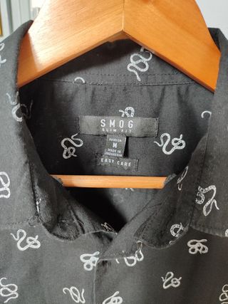 Preciosa camisa de la marca SMOG, talla M, con un estampado de serpientes. Es de color negro y tiene un corte entallado. - Diseño elegante y moderno. - Tejido suave y agradable al tacto. - Ideal para cualquier ocasión.