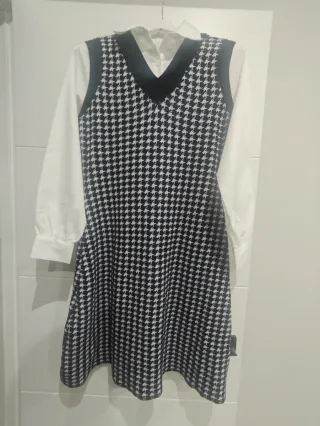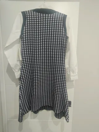 Vestido de lana fina con camisa interior incorporada. Presenta un estampado de pata de gallo en blanco y negro. - Diseño de cuello en V. - Manga larga en la camisa. - Largo hasta la rodilla.