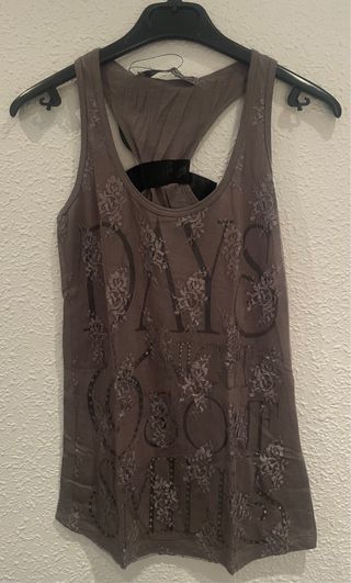 Camiseta de tirantes con detalle de blonda en la parte delantera. - Diseño de espalda nadador. - Estampado floral y de letras. - Adorno de lazo negro en la espalda.