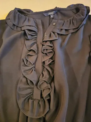 Elegante camisa negra con detalles de volantes. - Cuello con volantes. - Volantes en la parte delantera. - Mangas largas con puños. - Cierre de botones.