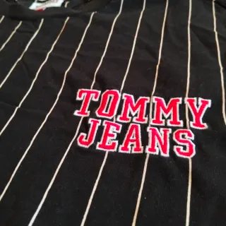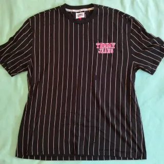 Camiseta de manga corta con un diseño de rayas verticales blancas sobre fondo negro. Presenta el logo de Tommy Jeans en el pecho. - Diseño de rayas verticales. - Logo de Tommy Jeans en el pecho.