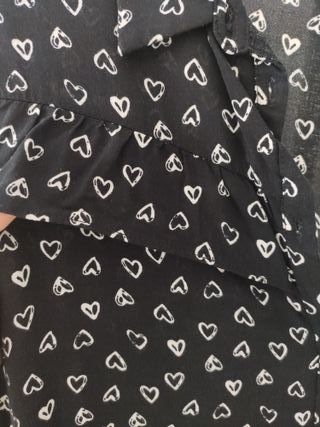 Camisa de manga larga con un estampado de corazones blancos sobre fondo negro. Presenta un cuello clásico y detalles de volantes en los puños y en la parte frontal de la camisa, como se ve en las fotos. La talla es la 170/176, es talla de niño. - Diseño de corazones blancos. - Cuello camisero. - Puños con volantes. - Volantes en la parte frontal. - Cuello: 38 cm. - Pecho: 50 cm. - Cintura: 52 cm. - Manga: 75 cm. - Largo: 70 cm.