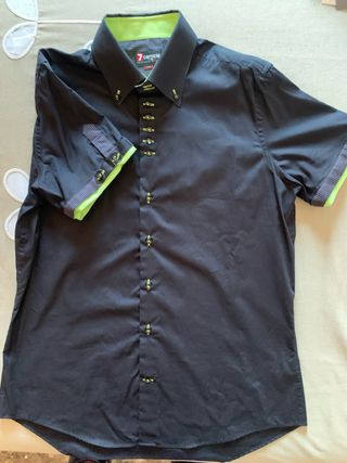 Camisa de manga corta con detalles llamativos. - Cuello con botones. - Puños con borde verde. - Botones frontales decorativos.