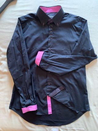 Elegante camisa de vestir de la marca 7 Camicie. Presenta un diseño moderno con detalles en contraste. - Cuello y puños con forro rosa. - Botones frontales y en puños a tono con los detalles. - Diseño de doble cuello.