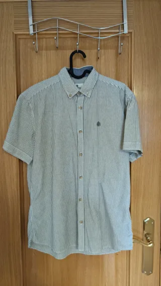 Se vende camisa de manga corta con diseño de rayas verticales de color verde y blanco. - Cuello con botones estilo Oxford. - Pequeño logo bordado en el pecho. - Cierre de botones en la parte delantera. Más prendas de ropa en mi perfil! Posibilidad de llevarte otra como obsequio de valor 0 al comprar esta.