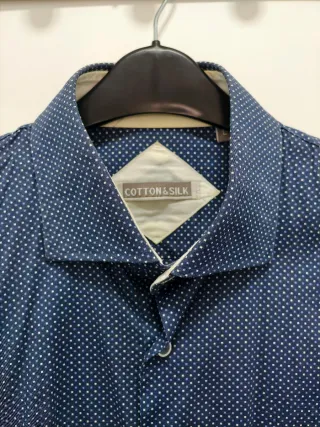 Conjunto de camisas para hombre. - Camisa de cuadros con tonos morados y blancos. - Camisa blanca lisa con textura. - Camisa blanca con cuello de botones. - Camisa azul con estampado de puntos blancos. Unidad:10 Eur Tallas: Blanca Easy wear:Talla 1(cuello corbata) Zara azul marino:Talla S Easy Wear blanca:Talla 2/S Morada cuadros: 3/M Harper & Neyer:Talla M