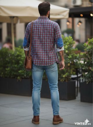 Camisa de cuadros para hombre. - Diseño clásico a cuadros. - Manga larga. - Colores burdeos, rojo, azul y blanco. - Algodón 100%. - Marca: Santa Marta - Modelo generado por IA. - Coderas en azul. - Cierre con botones en muñeca.