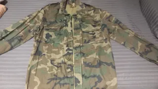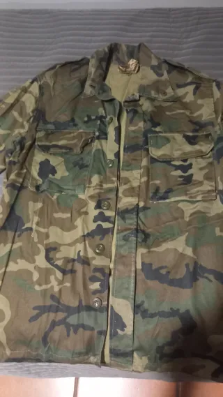 Camisa de camuflaje con estampado militar, usada para la caceria. Con bolsillos delanteros, coderas y hombreras. Usada pero bien conservada.