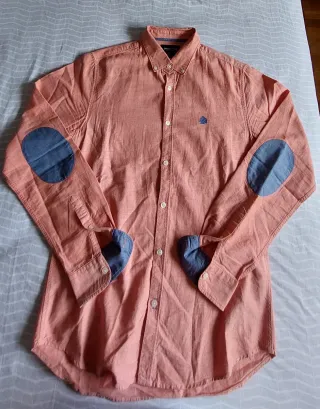 Camisa de manga larga en color salmon y con detalles en azul en los codos. Talla S.